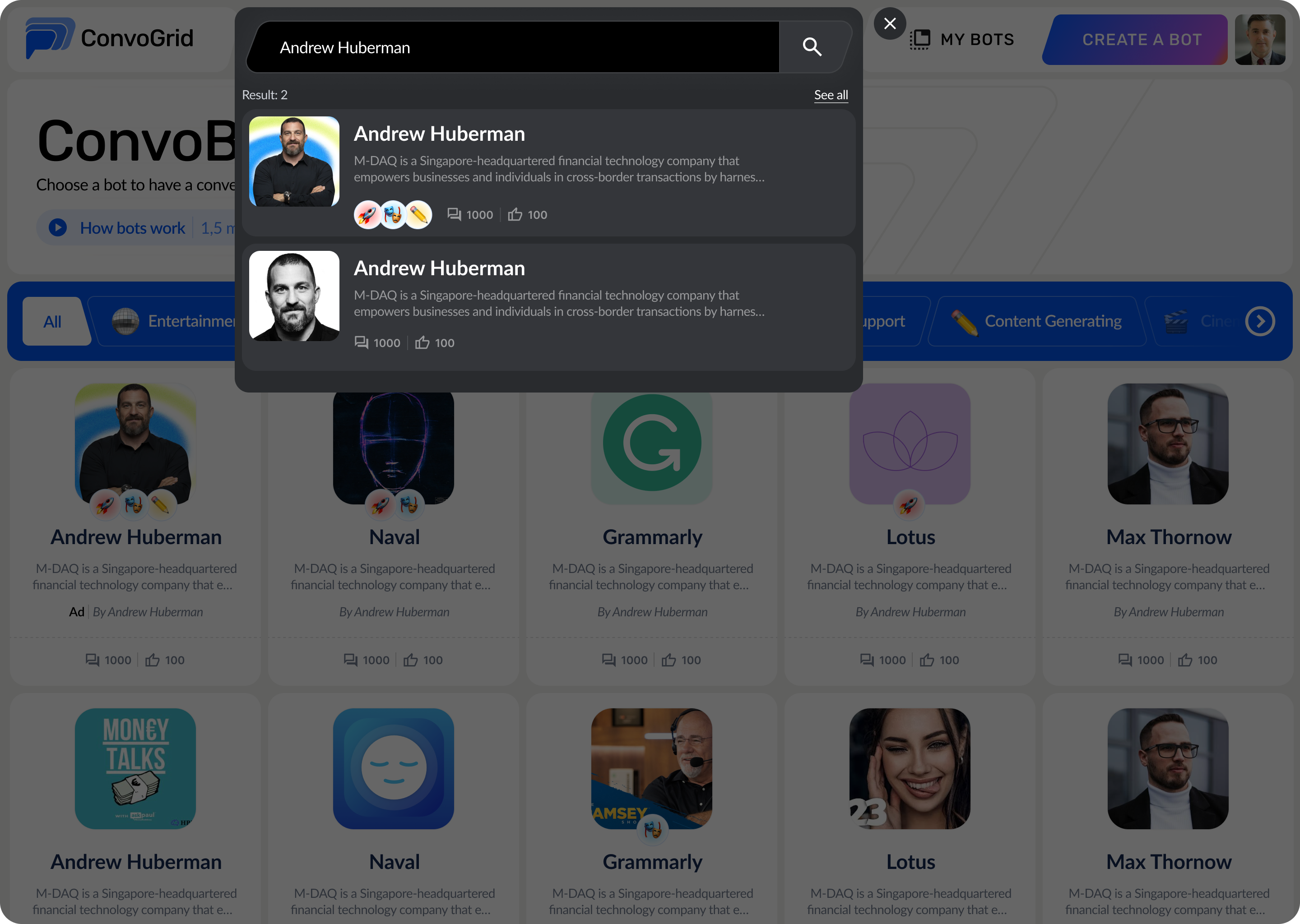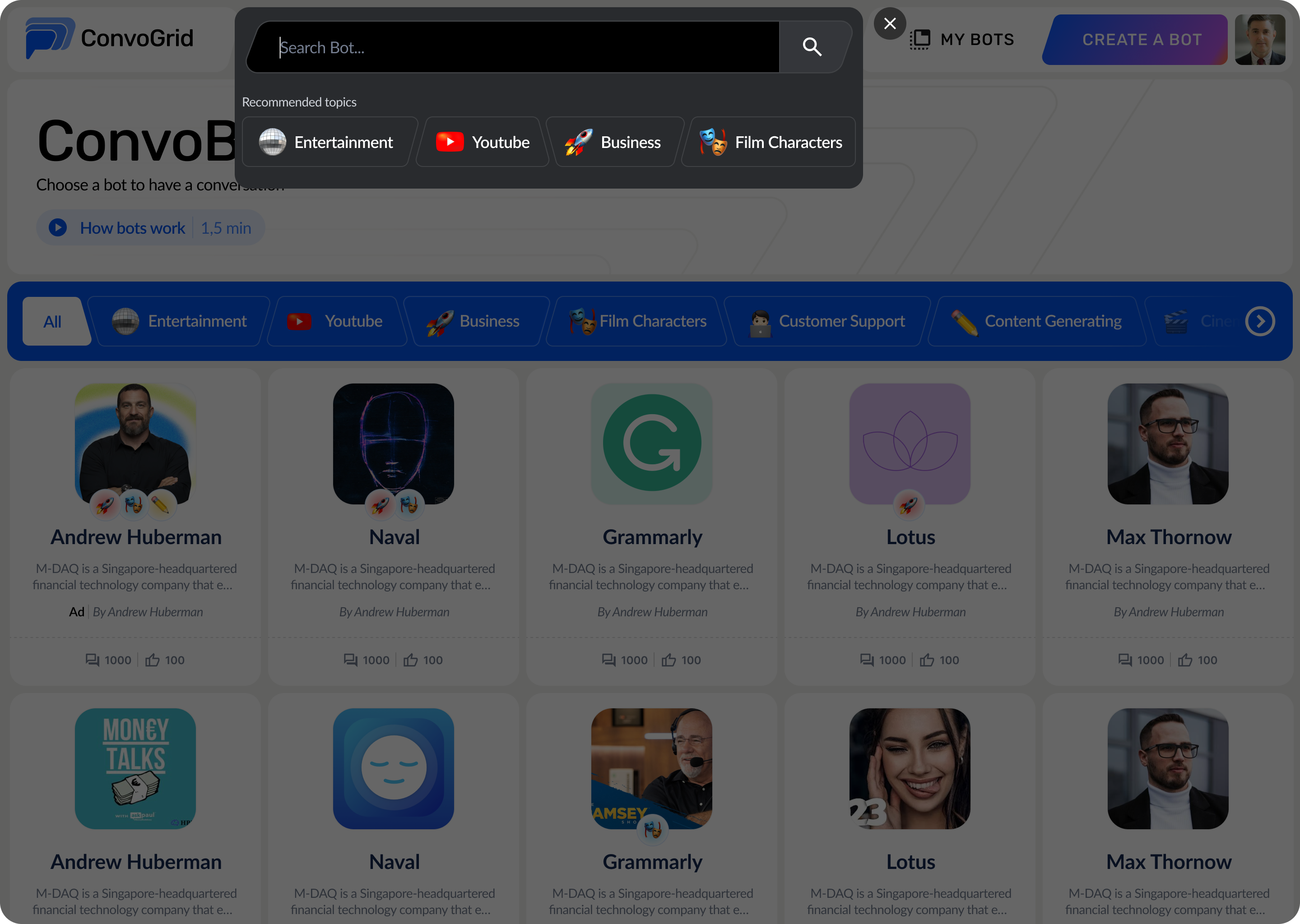 You can enter a search for a Bot by typing in the search bar, you can select from the recommended topics shown below, or even close the search bar by clicking on the cross button (X).