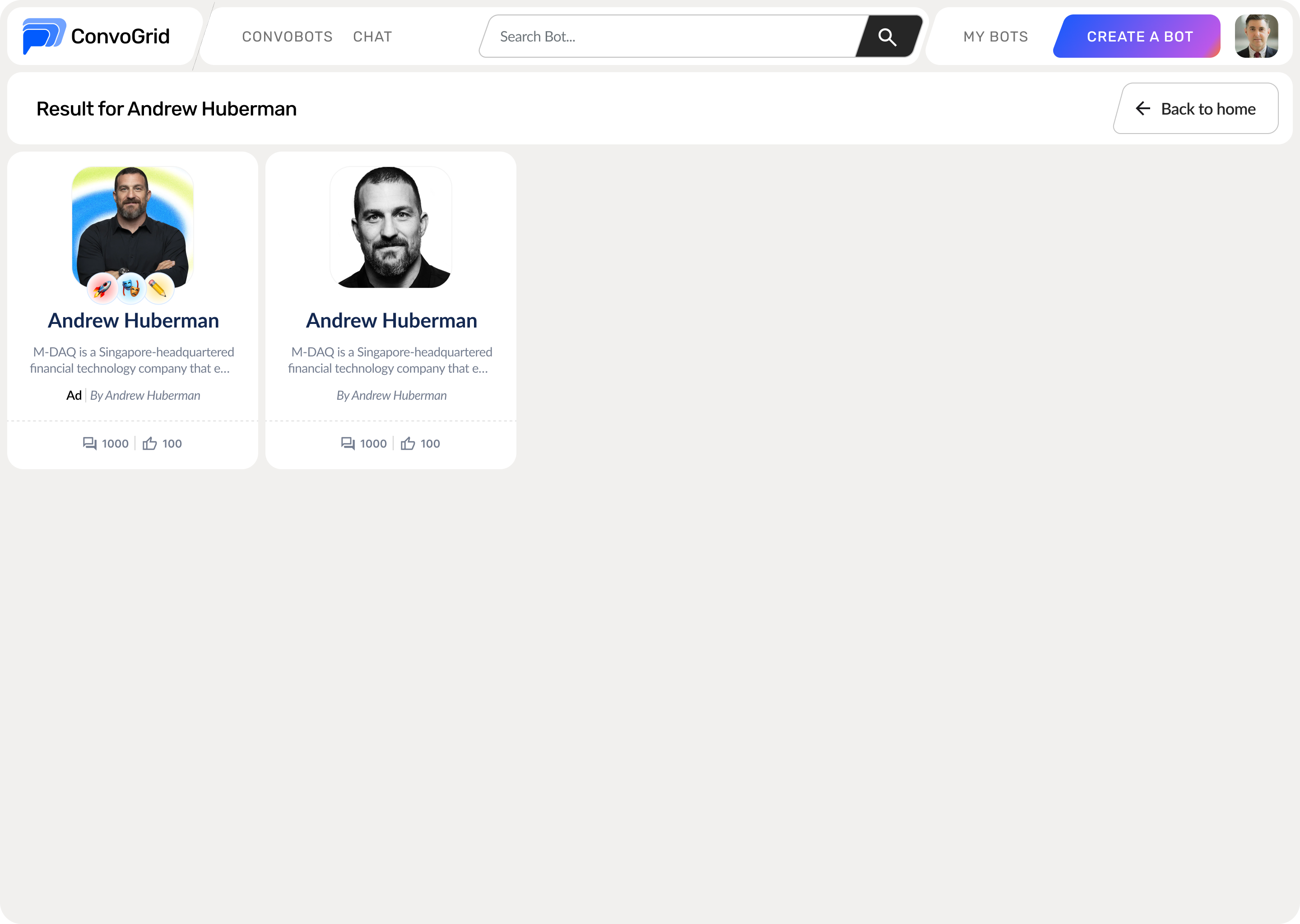You can always start a conversation from the homepage itself, but if the bot you are looking for is not available on the front page, you can easily search for a Conversational Bot (ConvoBot) by following the steps below.